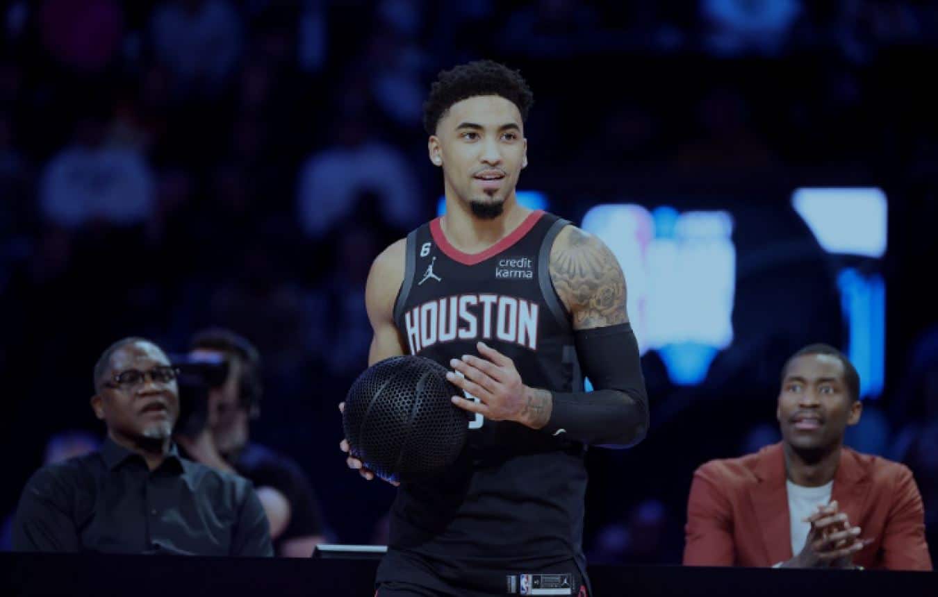 KJ Martin, ein Spieler der Houston Rockets, mit dem spielbaren 3D-Druck-Basketball bei der State Farm All-Star Saturday Night.(Bild: Pressefoto)