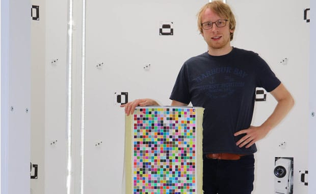 Schulungsleiter Dr. Marco Mattuschka samt dem Prototyp des neuen Fogra-3D-Medienkeils in der Photogrammetrie-Kabine (Bildausschnitt).