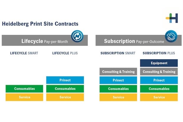 Die „Print Site Contracts“ sind in die Bereiche „Lifecycle Agreements“ und „Subscription“ unterteilt. Dabei hat der Kunde die Wahl zwischen vier Vertragspaketen mit unterschiedlichem Leistungsumfang und unterschiedlichen Bezahlmethoden. Diese reichen von einem sogenannten „Lifecycle Smart“-Vertrag, der Dienstleistungen und Verbrauchsmaterialien umfasst, bis hin zu einem „Subscription Plus“-Paket. Darin enthalten sind Beratung, Training, Service, Verbrauchsmaterialien, Prinect Software sowie Equipment-Lösungen. Heidelberg zufolge zielen alle Pakete „auf die Maximierung der Gesamtanlageneffektivität (OEE) beim Kunden ab und realisieren damit den eigentlichen Mehrwert gegenüber dem Kauf einzelner Komponenten“.