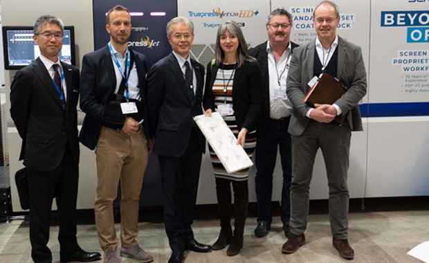 V.l.: Akihiro Fujii, stellvertretender Abteilungsleiter bei Screen GA; Patrick Jud, Bereichsleiter bei Screen Europe; Takanori Kakita, Präsident von Screen Europe; Petra Krenn, Geschäftsführerin der Ottweiler Druckerei; Frank Scheid, Produktionsleiter der Ottweiler Druckerei und Bernd Dörbach, Vertriebsleiter der Ottweiler Druckerei vor der Truepress Jet520HD+ von Screen.(Bild: Screen)