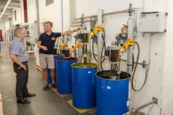 Weitere Vorteile des Systems von Samoa Flowtech sind für Bernd Eisinger „die hohe Verfügbarkeit und das einfache Handling der Anlagen. Zwei bis drei Knöpfe garantieren eine intuitive Bedienbarkeit – den Rest machen die Anlagen vollständig allein.“ Das Einsparen der Farbdosen hat natürlich auch positive Umwelteffekte. So etwa lassen sich die Fässer durch die Auspressvorrichtung besser entleeren, als das mit dem händischen Ausspachteln der Farbdosen machbar war. „Ebenso sparen wir bei der Beschaffung der Farbfässer für unsere zentrale Dosieranlage bares Geld, denn der Preis für ein 200-kg-Fass ist spürbar günstiger, als die gleiche Menge in herkömmlichen Farbdosen“.