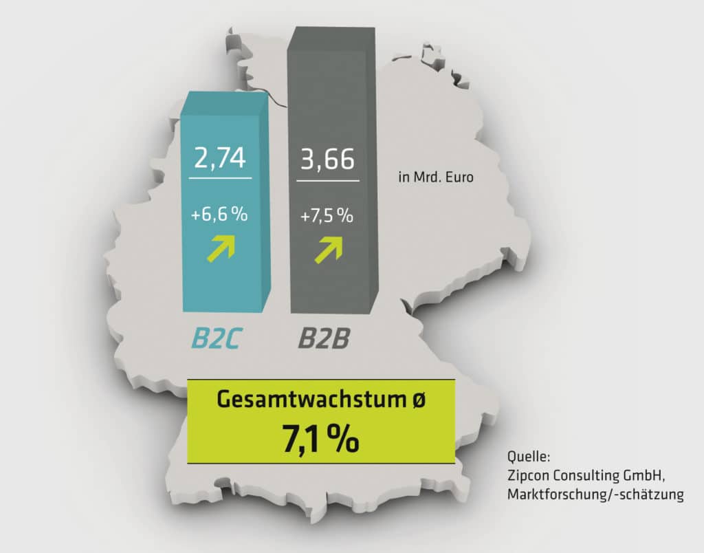 Prognostizierte Umsätze für den gesamten deutschsprachigen Raum. Das Verhältnis B2C- zu B2B-Umsätze verbleibt weiterhin ungefähr im Bereich 42:58%.