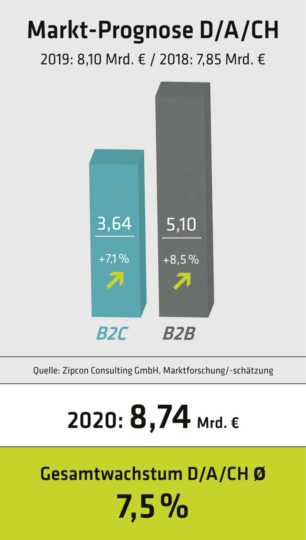 Und auch die Prognose für 2020 ist gut: Gerechnet wird im deutschsprachigen Raum mit einem Gesamtwachstum von rund 7,5% auf 8,74 Mrd. Euro – verteilt zu rund 42% auf B2C- und 58% B2B-Geschäfte (allerdings steht wie gesagt zu befürchten, dass die Corona-Krise diese Prognosen ad absurdum führen wird). Mit 6,4 Mrd. Euro werden allein in Deutschland fast drei Viertel dieser Umsätze generiert, wobei die gesamte Prognose laut Bernd Zipper nicht nur Shops berücksichtigt, sondern auch B2B-Portale sowie allgemein »onlinegetriebenen Umsatz«, der zum Beispiel aus der Kommunikation von Druckern mit den Kunden über APIs, über Netzwerke oder über die Cloud resultiert. [12951]