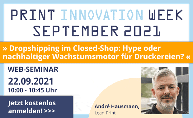 Dropshipping ist omnipräsent und bietet Druckereien enorme Potentiale mit wirksamen Wettbewerbsvorteilen. Sich auf das Thema einzulassen und zu evaluieren, ob sich Dropshipping für die eigene Druckerei lohnt, ist wichtig und notwendig. Einen guten Einblick ins Thema erhalten Sie in dem 45-minütigen Web-Seminar “Dropshipping im Closed-Shop: Hype oder nachhaltiger Wachstumsmotor für Druckereien?” am Mittwoch, den 22. September 2021, von 10:00-10:45 Uhr.