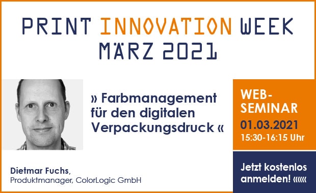Sollen PDF-Dateien, die im Design mit Sonderfarben angelegt worden sind, im digitalen Verpackungsdruck gedruckt werden, so müssen alle Bild- und Vektorelemente inklusive Sonderfarben in den Farbraum des Digitaldruckers konvertiert werden. Denn anders als im konventionellen Druck arbeiten Digitaldrucksysteme zumeist mit einer festgelegten Anzahl an Tinten, und Sonderfarben können nicht nach Belieben als Druckfarben eingesetzt werden. Was dies für das Farbmanagement bedeutet, erläutert im Rahmen der PRINT INNOVATION WEEK das 45-minütige Webseminar “Farbmanagement für den digitalen Verpackungsdruck” von ColorLogic. Das Seminar findet am Montag, den 1. März, von 15:30 bis 16:15 Uhr statt.