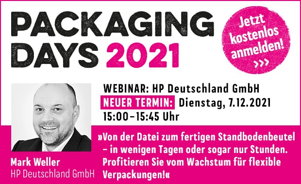 Wie man flexible Verpackungen im Digitaldruck produzieren kann, erklärt Mark Weller (HP) in seinem Online-Seminar „Von der Datei zum fertigen Standbodenbeutel“ am Dienstag, den 7. Dezember 2021 von 15:00 bis 15:45 Uhr. Die Teilnahme ist kostenlos.
