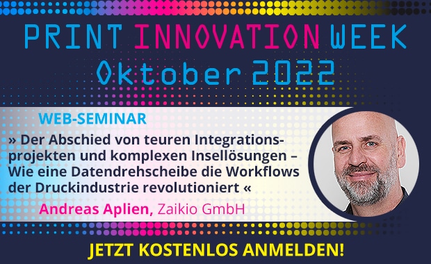 Teure Integrationsprojekte und komplexe Insellösungen waren gestern. Wie das gehen soll, erfahren die Teilnehmer dieses virtuellen Seminars der PRINT INNOVATION WEEK (Zaikio, 13.10.2022, 10:00 – 10:45 Uhr).