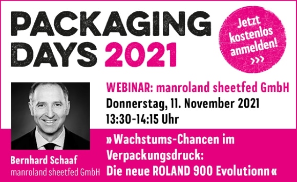 In dem Online-Seminar „Wachstums-Chancen im Verpackungsdruck: Die neue ROLAND 900 Evolution“ stellt Ihnen Bernhard Schaaf (manroland sheetfed GmbH) die wichtigsten Trends im Verpackungsdruck und die Features der neuen Produktlinie ROLAND 900 Evolution vor. Die Session findet am Donnerstag, den 11.11.2021, von 13:30 bis 14:15 Uhr statt.