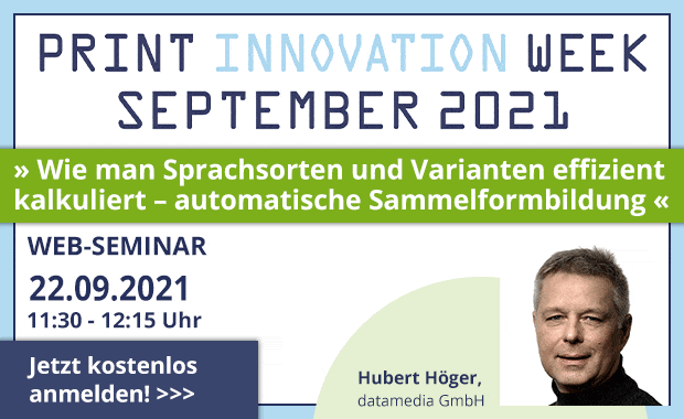 Druckereien kämpfen häufig mit sehr umfangreichen Produktionsanfragen. Verschiedene Sprachsorten und Ausführungsvarianten stellen leider für viele noch eine große Hürde in der Angebotserstellung, Kalkulation sowie in der Arbeitsvorbereitung dar. In einem kostenlosen Web-Seminar (22.9.2021, 11:30-12:15 Uhr) demonstriert der Experte Hubert Höger (datamedia GmbH) die Kalkulation einer komplexen Anfrage. Hierbei wird ein besonderes Augenmerk auf die Bogenaufteilung sowie auf die Bildung der Sammelform gelegt.