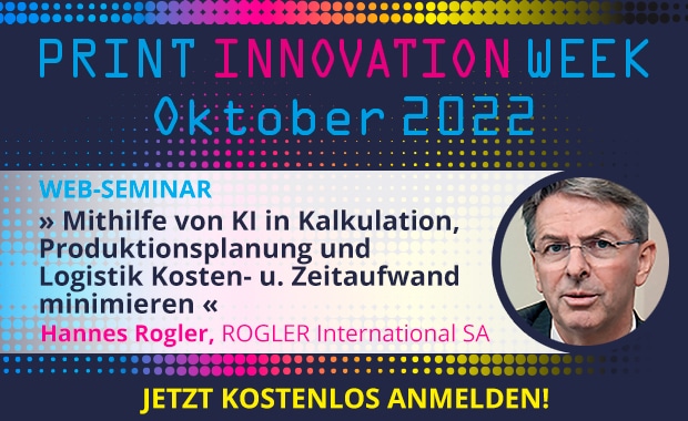In diesem virtuellen Seminar der PRINT INNOVATION WEEK (19.10.2022, 10.00 – 10.45 Uhr) erklärt Referent Hannes Rogler (Rogler International), wie sich durch den gezielten Einsatz von Künstlicher Intelligenz in Kalkulation, Produktionsplanung und Logistik sowohl Zeit als auch Kosten einsparen lassen.