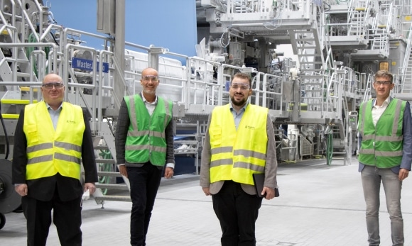 Beim Rundgang durch die neue Produktionslinie 8 in Kehl (v. l.): Gregor Andreas Geiger (Geschäftsführer Die Papierindustrie e.V), Dr. Stefan Karrer (Vorstand Technik, Koehler-Gruppe), Martin Gassner-Herz (MdB für die FDP), Joachim Uhl (Werkleiter, Koehler Paper Standort Kehl). (Bild: Koehler-Gruppe)