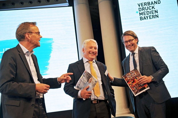 Bundesverkehrsminister Andreas Scheuer, BVDM-Hauptgeschäftsführer Dr. Paul Albert Deimel und VDMB-Hauptgeschäftsführer Holger Busch (v.r.n.l.) beim Bayerischen Druck- und Medientag 2018. (Bild: Astrid Schmihuber)
