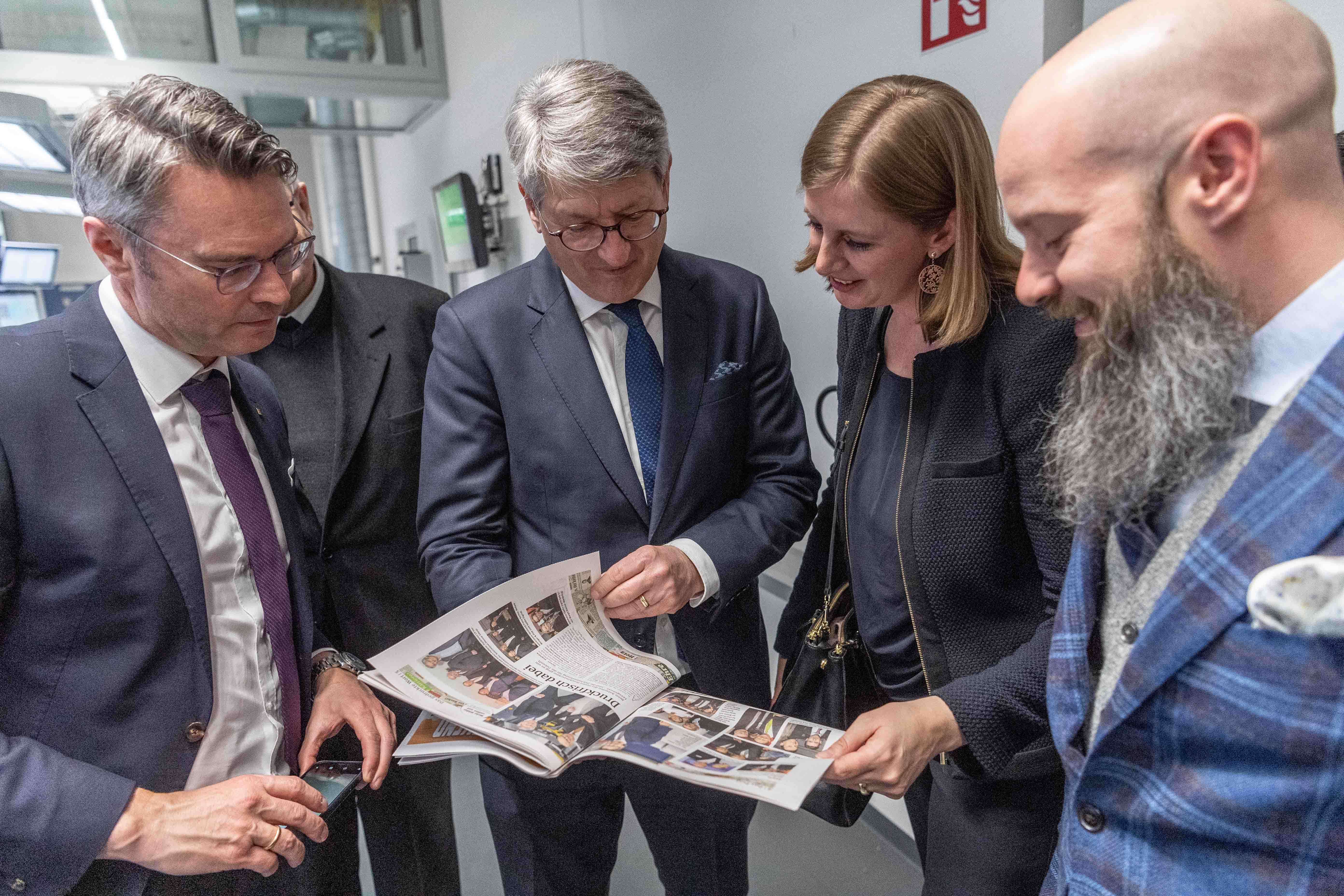 Beim Blick in den Einweihungs-Sonderteil der "Kleinen Zeitung": Rainer Stelzer (Vorstandsdirektor Raiffeisen-Landesbank), leicht verdeckt Bischofsvikar Heinrich Schnuderl, Styria-Vorstand Kurt Kribitz, die steirische Wirtschaftslandesrätin Barbara Eibinger-Miedl sowie Druck-Styria-Rotationsleiter Matthias Kroissenbrunner.(Bild: Juergen Fuchs, Copyright Kleine Zeitung)