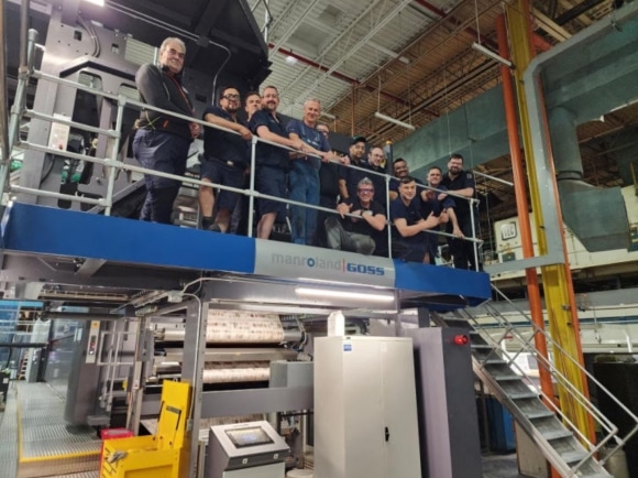 Technikerteam von Quad und manroland Goss vor der neuen Lithoman IV.(Bild: manroland Goss)