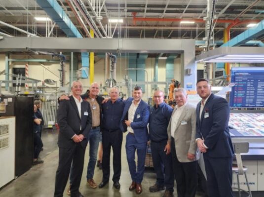 V. l.: Chris Brooks (manroland Goss USA), Bernhard Leichtle (manroland Goss Augsburg), Joel Quadracci (Chairman, CEO und Präsident of Quad), Serif Azizi (manroland Goss USA), Todd Stuckart (Druckproduktionsleiter bei Quad Hartford), Bill Barry (manroland Goss USA), Alex Lutton (manroland Goss USA).