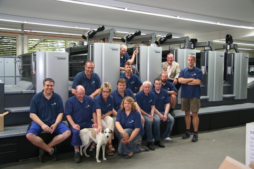 Das Team der Druckerei Wulf in Lüneburg an der neuen Heidelberg Speedmaster CX 102.