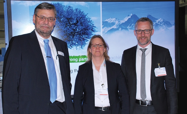 Geschäftsführerin Henrike Gieselmann und Controller Rudolf Lillmannstöns (rechts) zusammen mit Hans Leuenberger, Verkaufsleiter von Müller Martini.
