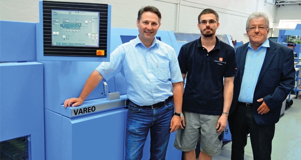 Von links: Geschäftsführer Dirk Hentschler, Maschinenführer Tim Fenner und Hans Thomas (Müller Martini Deutschland) vor dem neuen Vareo bei H. Heenemann in Berlin.