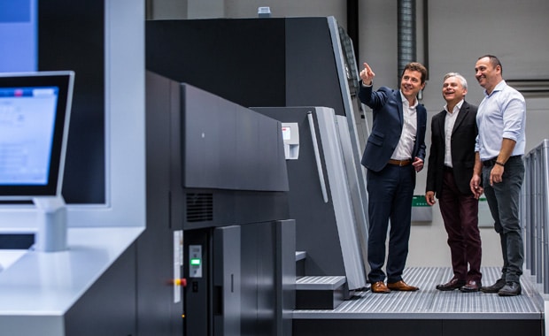 Im Bereich Pharmaverpackung führt die Rondo AG weltweit den ersten Betatest mit der Primefire 106 von Heidelberg durch. Joachim Hoeltz (links), CEO Rondo AG und Giovanni De Luca (rechts), Director Operations Schweiz Rondo AG, vervollständigen damit ihre Supply-on-Demand-Lösung. Beraten und unterstützt werden sie dabei von Philippe Andrey von Heidelberg Schweiz.