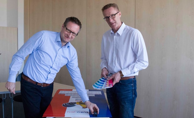 Carsten Zölzer (links) und Roland Schröder, beide Produktmanager UV der Hubergroup, begutachten einen mit den neuen UV-Farben gedruckten EM-2016-Planer.