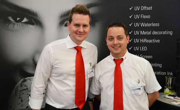 Unser Bild zeigt (v.l.) Dirk Bergmann, Key Account Manager, Jänecke+Schneemann Druckfarben GmbH, und Philipp Hölzl, Leiter Anwendungstechnik, Jänecke+Schneemann Druckfarben GmbH, während der „UV Days“ bei IST Metz im Juni 2013 in Nürtingen (Kreis Esslingen am Neckar).