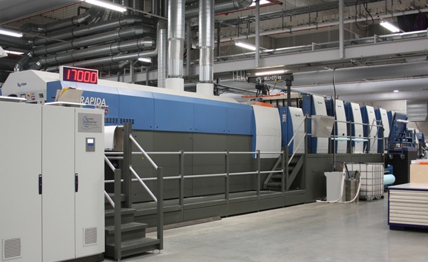 Die neue Sechsfarben-Rapida 145 mit Lackturm im Drucksaal des Unternehmens.