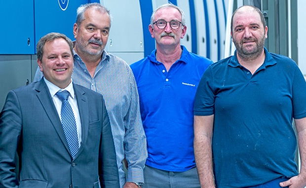 Vorm neuen Rapida-Jumbo (v.l.): Gavin Elflein, KBA-Deutschland; Günter Märker, Leiter Fertigung Ravensburger; Udo Feichtmeier und Christian Pischel (beide Ravensburger).