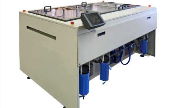 Entwicklungsmaschine für wasserlose Offsetdruckplatten TWP 680/1250. Bild unten: Mike Millea (Leitender Vertriebsbeauftragter bei Heights).