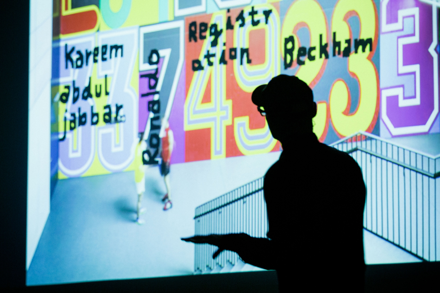 Schattenmann auf der Tÿpo St. Gallen: Andreas Uebele setzte den furiosen Schlusspunkt, im Hintergrund: Blick auf farbenfrohe „Wohlfühlwandbilder“ mit Zahlen-Buchstaben-Ornamentik aus der Welt des Sports fürs Adidas-Fitnessstudio. (Bild: Michael Bundscherer, http://event-fotos.org)