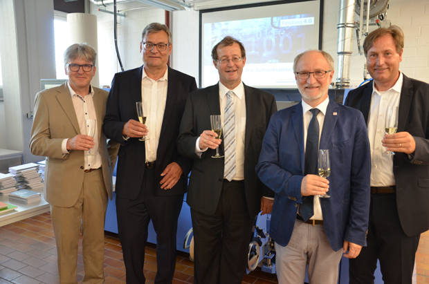 Die Vertreter der HDM und von Müller Martini stoßen auf die Inbetriebnahme des Klebebinders Vareo an.(Bild: Müller Martini)