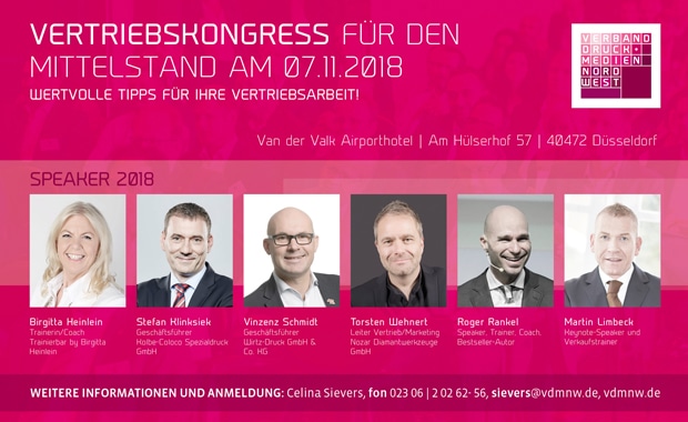 Der Vertriebskongress des Verbandes Druck + Medien Nord-West hat sich in den vergangenen Jahren zu einem – immer ausverkauften – Erfolgsformat entwickelt. In diesem Jahr hat sich der Veranstalter deshalb dazu entschieden, die Kongressthemen und die Zielgruppe zu erweitern. Eingeladen sind nicht nur Vertriebler, Fach- und Führungskräfte aus der Druck- und Medienbranche, sondern Mittelständler unterschiedlicher Wirtschaftszweige.