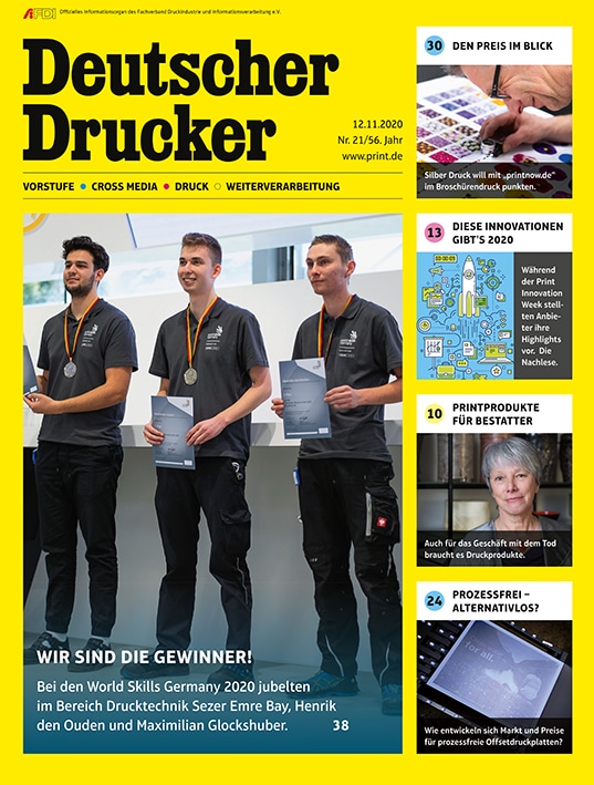 Ausgabe 21 ist speziell: Deutscher Drucker erscheint in neuem Outfit. Magaziniger, freundlicher und mit leichter lesbarer Schrift bringen wir ab sofort unsere Inhalte zu Ihnen. Dabei liegt der Fokus künftig noch stärker auf den Menschen, die die Branche voranbringen. In dieser Ausgabe geht es zum Beispiel unter anderem um die jungen Nachwuchsdrucker, die sich bei den World Skills Germany hervorgetan haben. Der Innenteil dieser ersten Ausgabe im neuen Design wurde auf das mehrfach gestrichene Bilderdruckpapier Novatech matt in 90 g/qm gedruckt, der Umschlag auf Novatech matt in 135 g/qm. Novatech ist erhältlich bei Antalis.