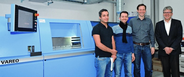 Von links: Abdallah Al-Chaarawi (Abteilungsleiter Druckverarbeitung), Mazlum Dülger (Technischer Bereichsleiter Postpress), Daniel Barth (Produktionsleiter) und Peter Stein (Gebietsverkaufsleiter Müller Martini Deutschland) vor dem neuen Vareo bei Walter Digital.(Bild: Müller Martini)
