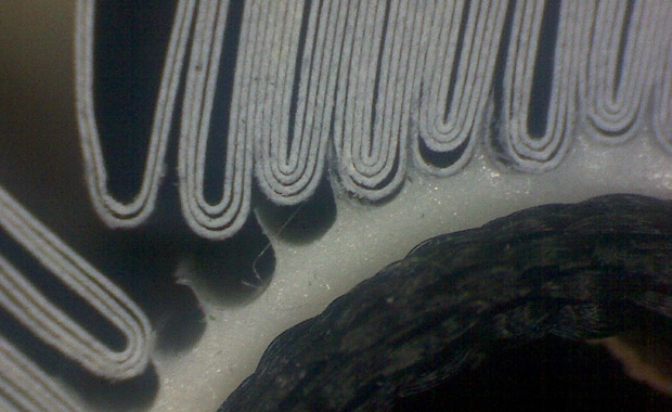 Entsprechend den durchgeführten Tests zeigte die Fadenheftung eine gute Qualität. Neben der Verankerung der Druckbogen im Bund durch die Fadenheftung wird die Festigkeit des Buchblocks durch die Einzelverbindung der gehefteten Falzbogen mittels der Rückenableimung hergestellt. Obgleich die noch nicht benutzten Bände aus der Auflage nach dem einmaligen Aufschlagen bei den Pulltests noch keine Klebestörungen der Rückenableimung aufwiesen, ließ sich doch eine relativ weiche Konsistenz des zur Ableimung eingesetzten Hotmelts feststellen.