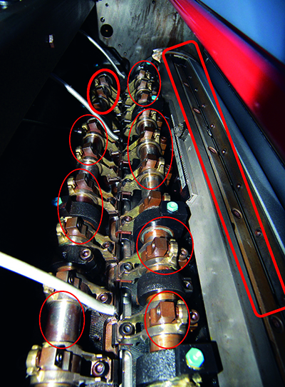 Abbildung: Korrosionsangriff (rote Markierungen) an metallischen Bauteilen der Zylinder am vierten Druckwerk.