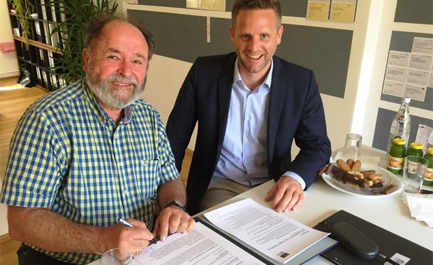 Dr. Paul Müller, Geschäftsführer der Augsburger Stadt Zeitung (links), und Dr. Martin Huber, Geschäftsführer Gogol Medien, bei der Vertragsunterzeichnung.