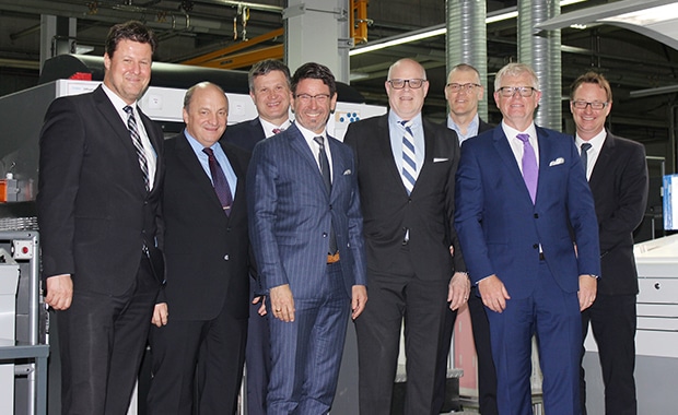 Die CEOs der beiden Firmen – Dr. Michael Faller (vierter von links) und Dr. Daniel Keesman (zweiter von rechts) von Faller und Rainer Hundsdörfer (vierter von rechts) von Heidelberg – und ihre Teams freuen sich auf die digitalisierte Zukunft.