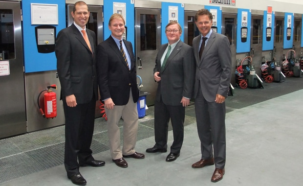 Freuen sich über die gemeinsame Entwicklung des neuen Sieben-Farben-Inliners MARTIN FFG 924 NT RS inklusive Lackwerk sowie Infrarot- und UV-Trocknung (von links nach rechts): Ralph Schuck (Geschäftsführer Bobst Lyon), Maximilian und Detlef Boltersdorf (beide Geschäftsführer Brohl Wellpappe) und Dick van Bruggen (Geschäftsführer Bobst Meerbusch).