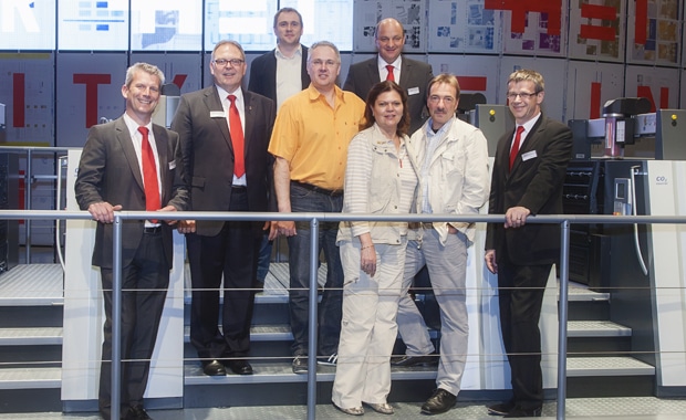 Auf der Drupa 2012 bestellte die Druckerei Schreckhase gleich vier Speedmaster XL 106: (von links nach rechts) Andreas Lang, Vertriebsleiter HDD; Heinz Höfler, Vertriebsbeauftragter HDD; die Schreckhase-Geschäftsführer Matthias und Marcus Schreckhase; Alexander Schuster, Leiter Region Mitte, HDD; Schreckhase-Geschäftsführer Michael Hoelscher mit Frau und Stephan Plenz, Heidelberg Vorstand Equipment.