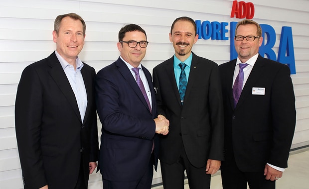 Nach der Vertragsunterschrift: v.l.n.r, Jochen Grossmann, Geschäftsführer Druck- und Pressehaus Naumann; Christoph Müller, Geschäftsführer KBA Digital & Web Solutions; Oliver Naumann, Verleger und Geschäftsführer Druck- und Pressehaus Naumann und Günter Noll, Vertriebsleiter KBA-Digital & Web Solutions