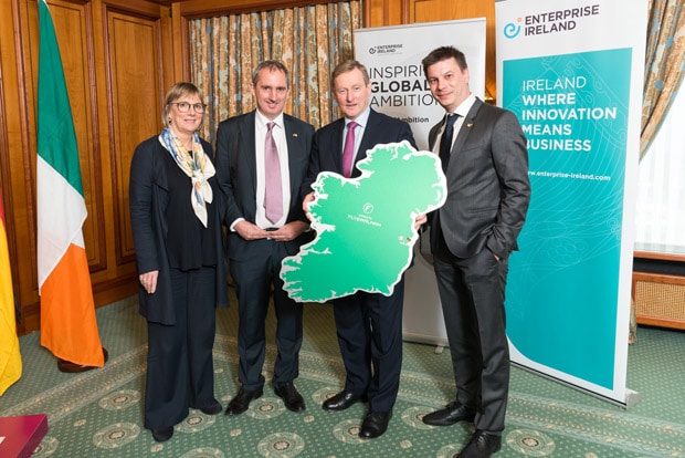 Als individuelles Gastgeschenk gab’s Irland auf einer Alu-Dibond-Platte (von links): Julie Sinnamon (CEO Enterprise Ireland), Jerry Kennelly (CEO „Tweak“), Irlands Premier Enda Kenny und Stefan Constantin (Mitglied der Geschäftsführung Flyeralarm).