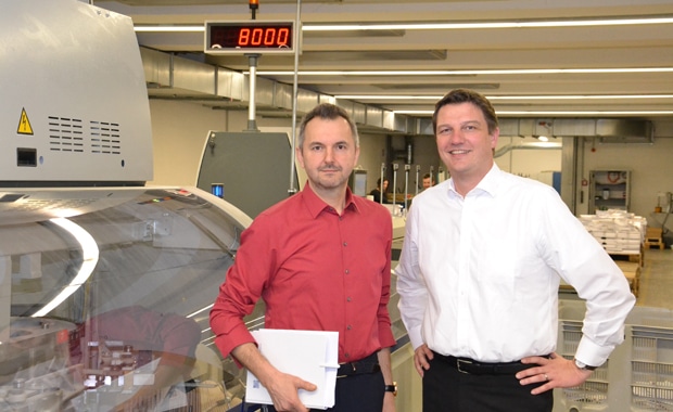 Guido Plaßmann (Leitung Technik bei Kohlhammer Druck, r.) und Rudi Gombar (Abteilungsleiter Weiterverarbeitung) am neuen Kolbus-Klebebinder KM 610.