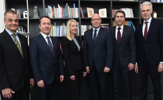 Der Vorsitzende der Geschäftsführung, Martin Wunnike (links), und sein Geschäftsführer-Kollege Manfred Sauerer (rechts) hier mit Alexandra Wildner (3.v.l.), Michael Kusch (3.v.r.), Bernd Riffel (2.v.l.) und Josef Pöllmann (2.v.r.).
