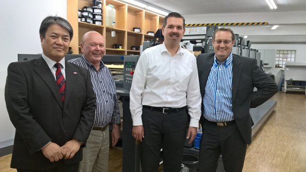 Kohei Yatsumoto (General Manager RMGT), Claus Müller und Elmar Müller sowie Oliver Lucas (Vertrieb der Konica Minolta Industrial Printing) sind hochzufrieden vor der neuen RMGT 925 LED UV Offsetdruckmaschine.