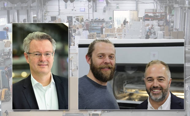 Die Onlineprinters-Gruppe hat den britischen Onlinedruck-Dienstleister Solopress übernommen. Im Bild: Onlineprinters-Geschäftsführer Dr. Michael Fries und die beiden Gründer von Solopress Andy Smith und Aron Priest (v.l.).