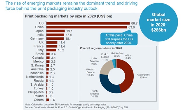 Prognose der größten Verpackungsdruck-Märkte im Jahr 2020 nach Mrd. US-Dollar Gesamtumsatz.(Bildquelle: VDMA/NPES/EIU)