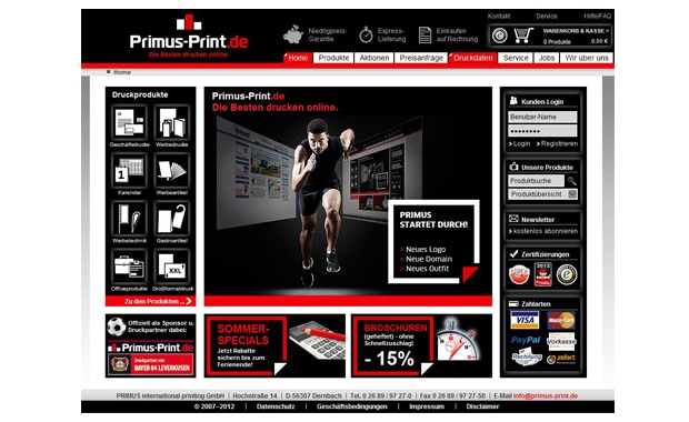 Bei Primus stehen seit Kurzem statt “Blau und Gelb” die neuen Hausfarben “Schwarz und Rot” für die Druckerei. Im Zuge des neuen Erscheinungsbildes wurde auch der Webshop neu gestaltet und die neue Domain “Primus-Print.de” ins Leben gerufen. Ergänzt wird das neue Primus-Logo durch den Slogan “Die Besten drucken online”. Mit diesem Slogan, der neuen Domain und der neuen Corporate Identity will sich das Unternehmen als serviceorientierte, qualitätsbewusste und preiswerte Druckerei am Markt positionieren.