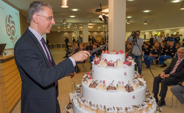 Beim internen Auftakt des Firmenjubiläums in Oberschleißheim schnitt Roland Schreiner, geschäftsführender Gesellschafter in dritter Generation, eine mehrstöckige Torte an, von der jeder Mitarbeiter ein Stück mitnehmen konnte.