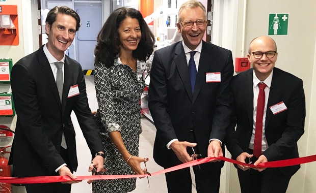 Siegwerks neue Produktionsanlage für Inkjet-Farben in Annemasse (F) wurde am 13. Oktober 2017 eröffnet (v.l.): Jens Adrio (Head of Corporate Development), Veronique Danois (President of Siegwerk France), Herbert Forker (CEO) und Matthieu Carni (Business Development Manager).