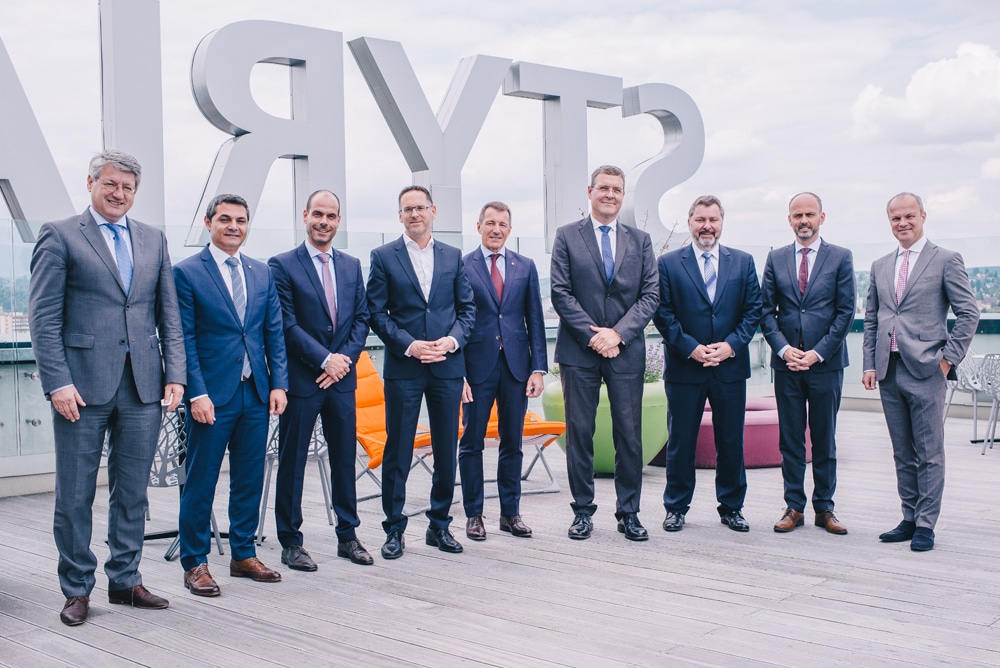 Gruppenbild nach der Vertragsunterzeichnung: Die Führungsspitze der Styria (ganz rechts der Vorstandsvorsitzende der Styria Media Group AG, Markus Mair, links Vorstandsmitglied Kurt Kribitz) und die Vertreter der Maschinenlieferanten Manroland bzw. Ferag. (Bildquelle: Ballguide/Gregor Hiebl).